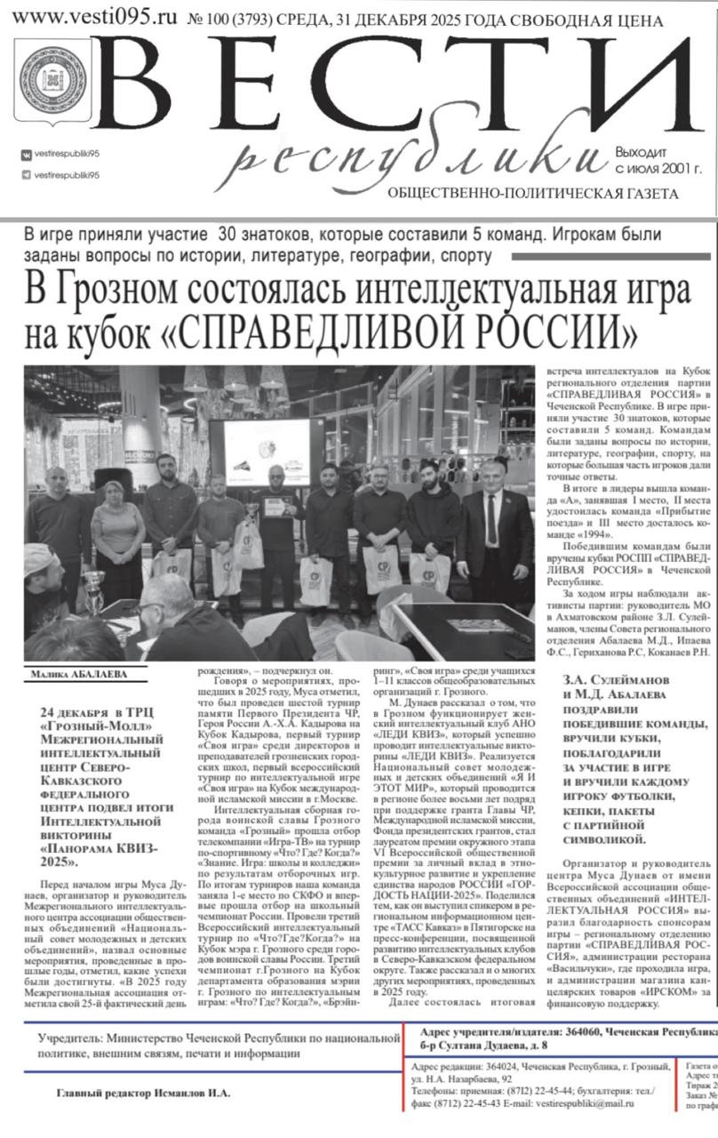 регионального отделения партии "СПРАВЕДЛИВАЯ РОССИЯ" в Чеченской Республике. В игре приняли участие 30 знатоков, которые составили 5 команд. Командам